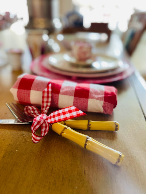 This year I pulled out everything pink or red and put it all together! On Valentine's Day it just works. I did create DIY red and pink marbleized chargers from some thrift store finds. Everything else (except the candy) I had on hand and most of it has been thrifted over time.