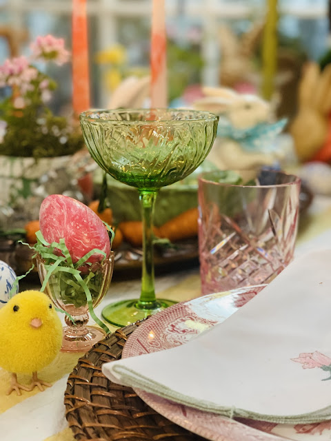 For the Easter Brunch table I brought the storage container marked "Easter decorations' upstairs from the basement and then just threw everything in there at the table! Bunnies, chicks, eggs, asparagus shaped candles and more!